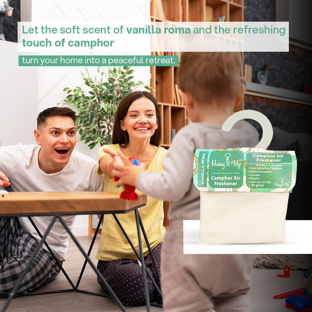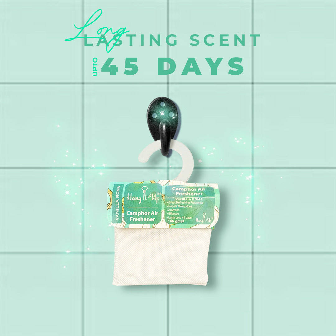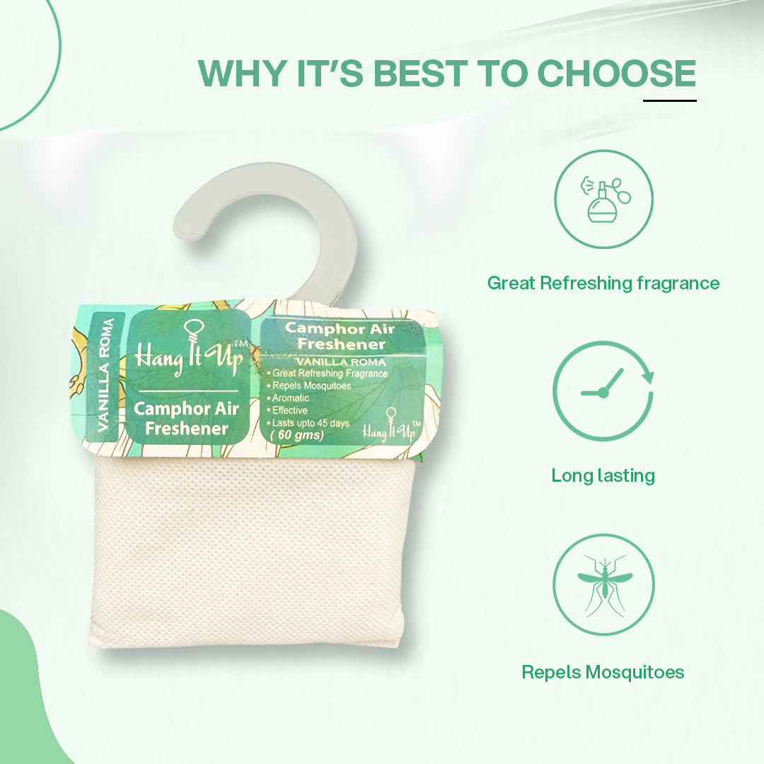 Absolutely love the Hang It Up camphor pouch! The camphor provides that natural clean vibe, blended seamlessly with vanilla for a long-lasting freshness. Ideal for my living room—odors vanish quickly. Simple design makes it a go-to for any space needing a refresh.